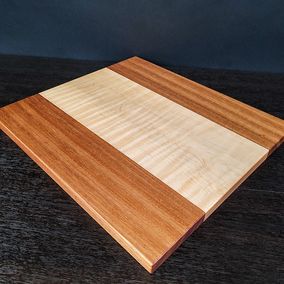 Expertly crafted from rich, durable Curly Maple and Mahogany, this cutting board is a must-have for any kitchen. Its unique wood combination not only adds a touch of elegance, but also provides a sturdy and long-lasting surface for all your food preparation needs. Upgrade your cooking experience with this beautiful cutting board.