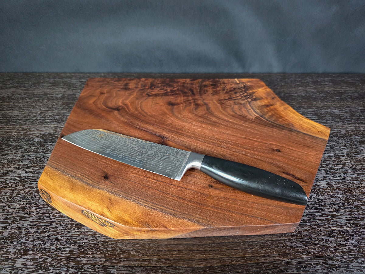 Crafted from premium curly walnut, this live edge cutting board combines natural beauty with exceptional durability. Its unique grain patterns and smooth finish make it ideal for both food preparation and elegant serving. The live edge preserves the wood’s organic character, adding a sophisticated touch to your kitchen while providing a sturdy, knife-friendly surface that resists wear over time. Perfect for chefs seeking a blend of functionality and artisanal craftsmanship.