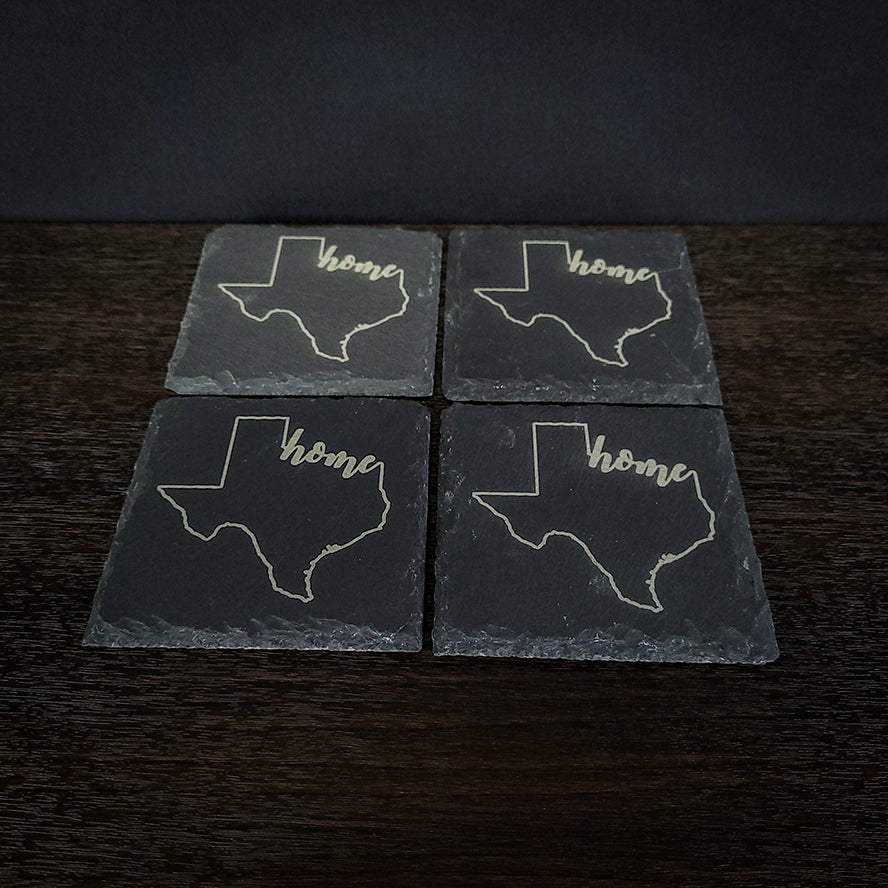 Introducing the Texas Home Laser Engraved Slate Coaster Set - a perfect addition to any home! Protect your furniture while adding a touch of Texas pride. Made of high-quality slate, each coaster displays a laser engraved outline of the Lone Star State. A stylish and practical choice for any Texan or Texas-lover.