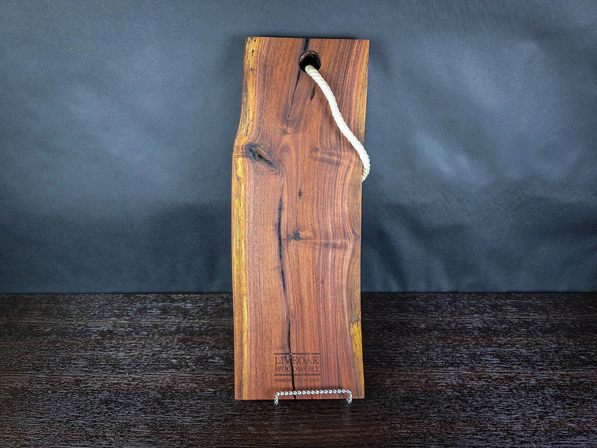 Crafted from rich walnut wood, this charcuterie board offers durable elegance for presenting meats, cheeses, and appetizers. The sturdy rope handle provides easy transport and adds a rustic charm, making it ideal for both casual gatherings and sophisticated entertaining. Its smooth surface highlights walnut’s natural grain while allowing effortless slicing and serving. This board combines functionality with timeless design, elevating your culinary presentation with expert craftsmanship.