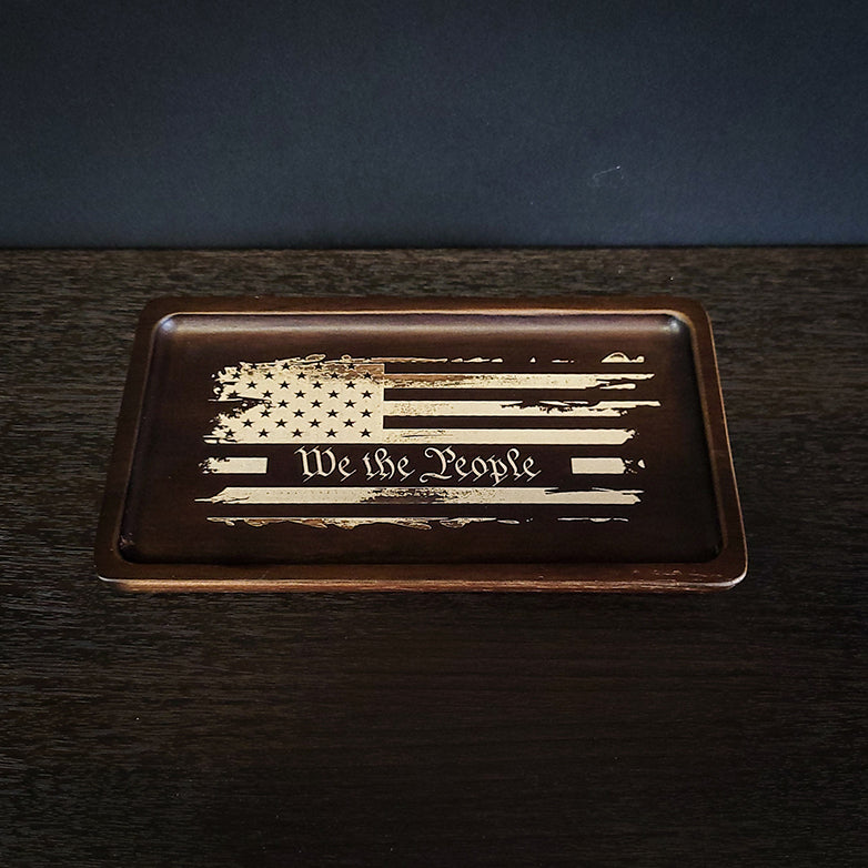 The We The People Flag Tray is a catch all tray featuring the iconic "We The People" flag design. Keep your belongings organized and add a patriotic touch to your space. Made from high-quality materials for lasting durability. Show your love for your country with this expertly crafted tray.